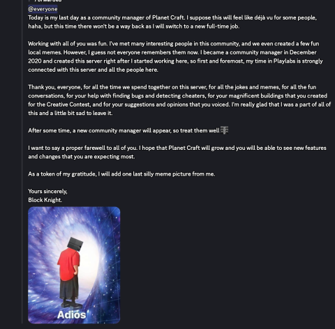 As we (people who use PoC discord) know from reading the announcements, the community manager of Playlabs LLC, Block Knight is leaving and going to another job. We ought to thank him for the good memories, forum help, game support, keeping the game safe, adding many features, and keeping the game rather stable in the community context.