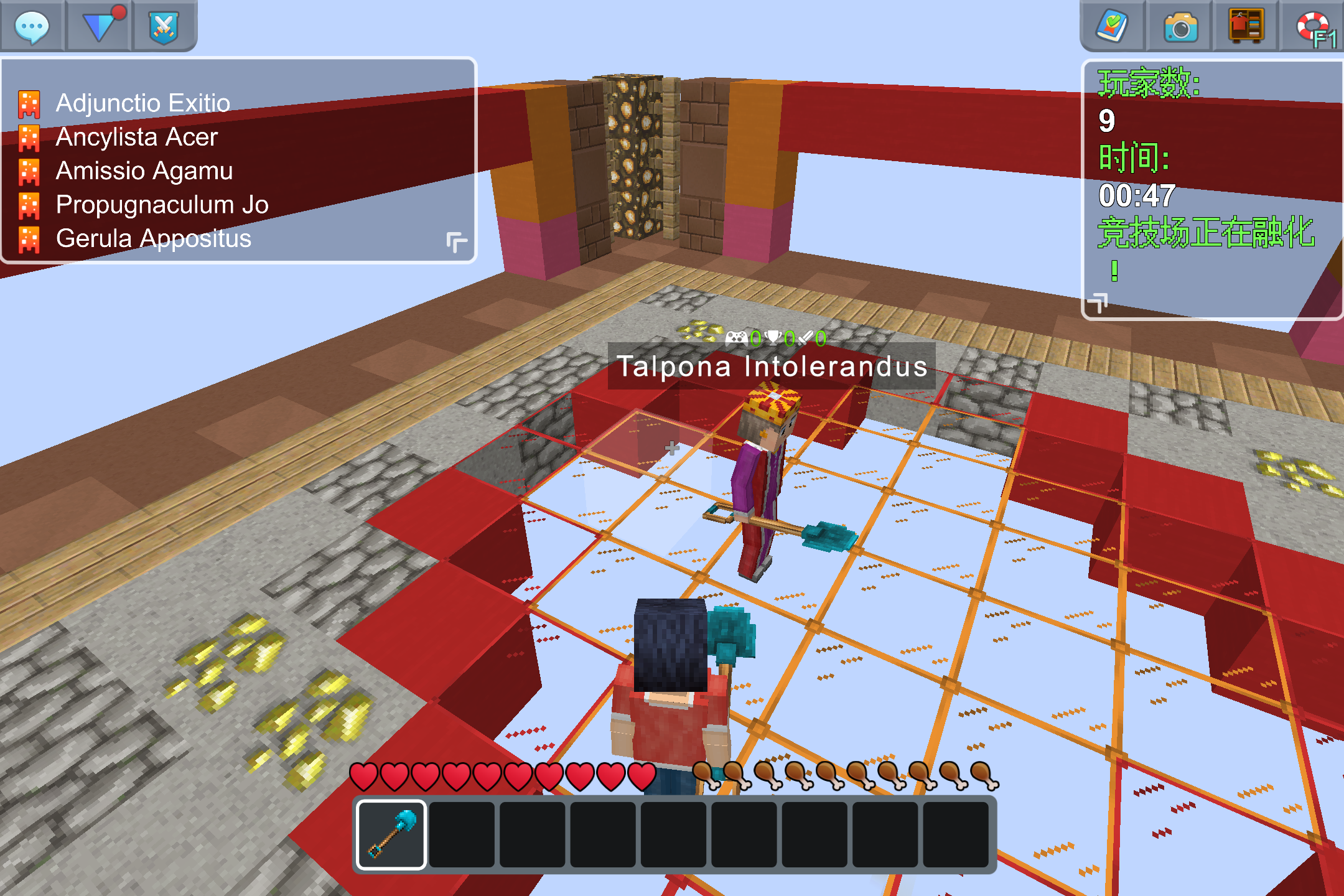 It was my first time in the spleef mini-game that I encountered two players appearing together in the waiting area after the game had already started. I finally killed him with a fireball and waited for the victory.