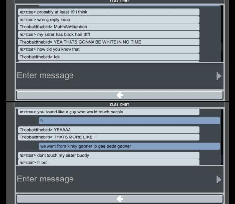 Hello there, I haven't submitted a report in a bit but basically theres this dude in our clan (INVS) who is acting like a pedophile, and it sounded WAY too realistic. Please look into this because im concerned.