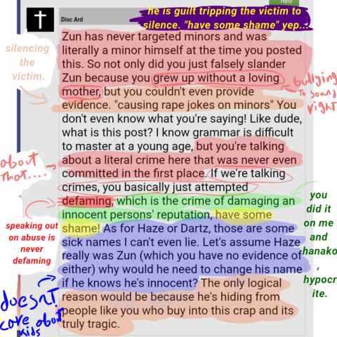 Gaslighting and guilt tripping victims to silence: this is in the screenshot below, specifically "if we are talking crimes, you basically attempted defamation, Which is the crime of damaging someone innocent's reputation. Have some shame!"