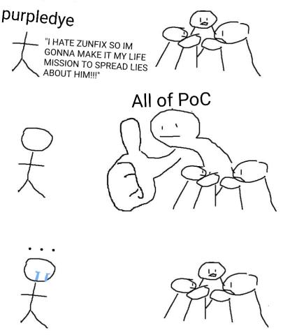 Hello everyone, purpledye here. today i will be talking about something, with a more tame manner so it doesn't get taken down again. And also for documentation in case someone wants to understand why zunfix got banned. And why defending an absolute degenerate who is still sulking about his lost account is so pathetic. (The last bit is my opinion, not the public's.) let's start with a 'brief' introduction.