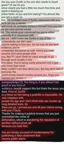 "Zunfix is a minor so him being a pedofile is impossible. He only roleplays with people his age and i don't think kids can muster up long detailed texts." The constant use of 'kid' hints how you see grooming, just a child's play, lack of empathy, attacking those who helped expose him. The constant avoidance of evidence scattered of him being a creep only to say "i genuinely think zunfix is a victim..." He doesn't roleplay with people his own age, even younger people. He does write long detailed texts during roleplay and e-sex.