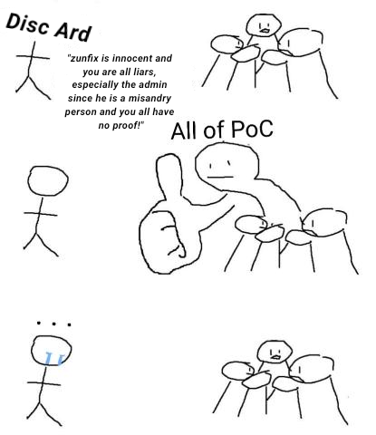 Disc Ard, cant tell difference between explaining misinformation for future players who might sympathizes with him, a groomer, and spreading lies? Whatever. It's my word, proofs and actual victims against you, who has no proof, no witnesses and no word from zunfix himself telling you he didn't do it. Now if you mind me, imma go have fun. Because "the world doesn't revolve around you" and him. :) note: you can't prove me wrong.